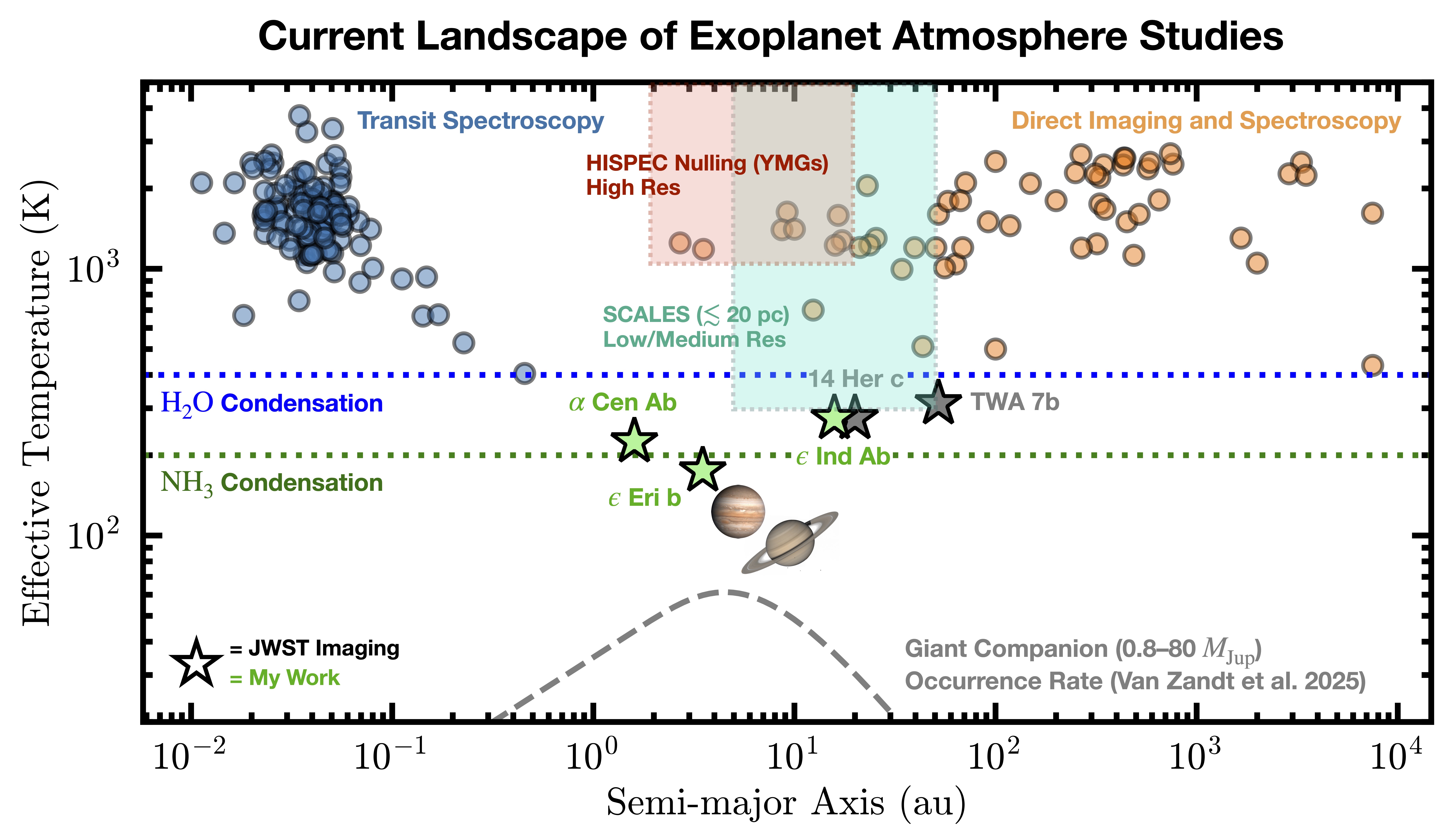 My primary research interest lies in investigating the formation and evolution of Solar System-analog extrasolar gas giant planets using high-contrast imaging and spectroscopy. The most typical giant exoplanets are located at separations between 1-10 au from their host stars. Traditionally, this population has not been accessible to direct characterization techniques either because their corresponding angular separations are too small for detection around young stars located in moving groups (~10-100 pc) or the planets are too cold for near-infrared ground-based observations around mature field stars in our vicinity (within 10 pc). I am tackling both challenges in my work to bridge the exoplanet characterization gap.